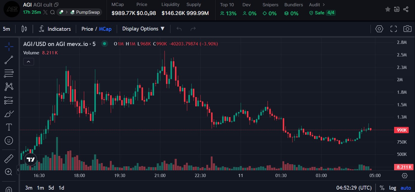 $AGI được xây dựng trên Solana, nổi tiếng với tốc độ giao dịch nhanh và chi phí thấp, phù hợp cho memecoin. Tổng cung là 999.99M, giá hiện tại khoảng $0.98 (dựa trên dữ liệu gần nhất). Hành động đốt LP tokens sau khi thêm thanh khoản tăng khan hiếm và tạo niềm tin, dù do AI thực hiện, đặt nó vào vị trí đặc biệt nhờ công nghệ tự động.