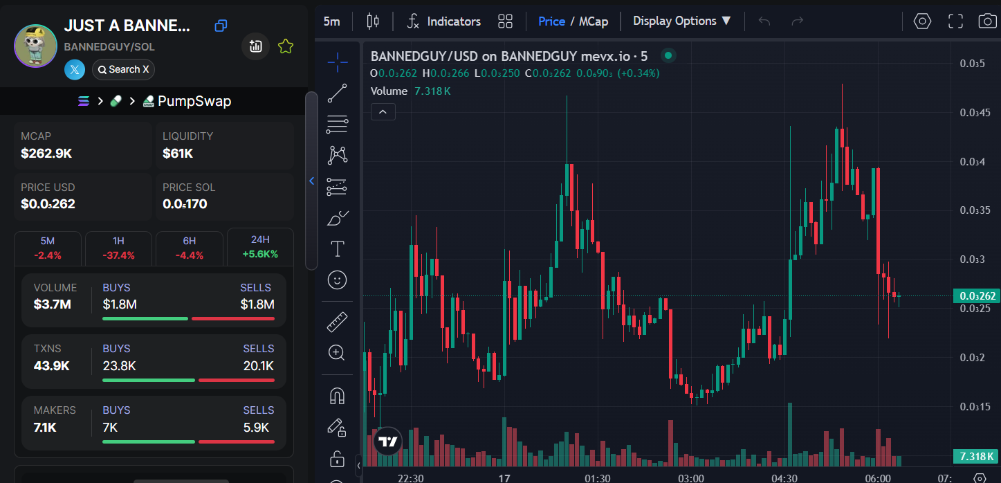 Dựa trên dữ liệu từ biểu đồ giao dịch MevX, BANNEDGUY đang thể hiện sức hút mạnh mẽ nhưng cũng đầy biến động: