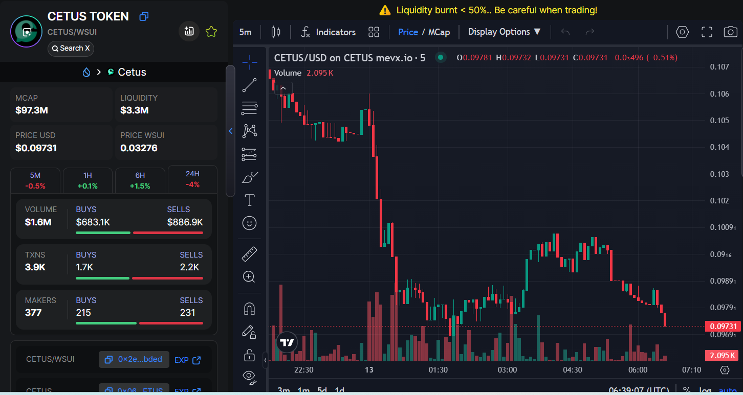 • Giá hiện tại 0.09731 USD, giảm -4% trong 24 giờ, kèm cảnh báo liquidity burnt > 50%, cần thận trọng.