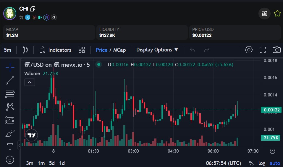 - Giá hiện tại: $Chi được giao dịch ở mức 0,00122 USD, với biến động tăng 5,62% trong 5 phút gần nhất, phản ánh sự quan tâm mạnh mẽ từ cộng đồng.