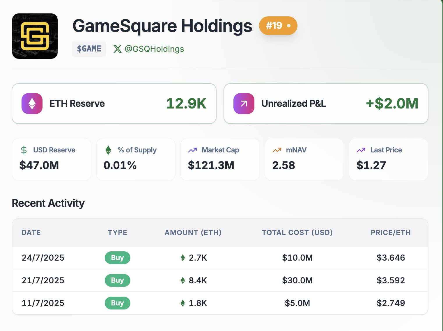 Các hoạt động mua gần đây bao gồm: 2,7 nghìn ETH (10 triệu USD) vào 24/07/2025 với giá 3.646 USD/ETH, 8,4 nghìn ETH (30 triệu USD) vào 21/07/2025 với giá 3.592 USD/ETH, và 1,8 nghìn ETH (5 triệu USD) vào 11/07/2025 với giá 2.749 USD/ETH. Con số này phản ánh chiến lược tích cực của GameSquare trong bối cảnh thị trường NFT đang sôi động.