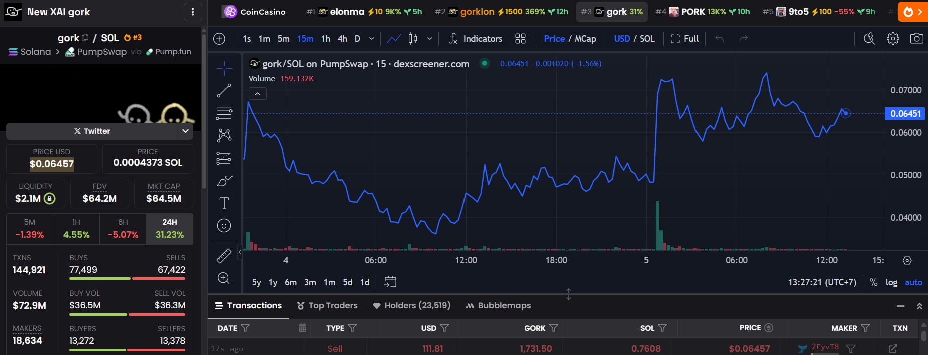 - Vốn hóa thị trường hiện tại (Market Cap): $GORK hiện có vốn hóa 64,5 triệu USD, với giá mỗi token là 0,06457 USD.