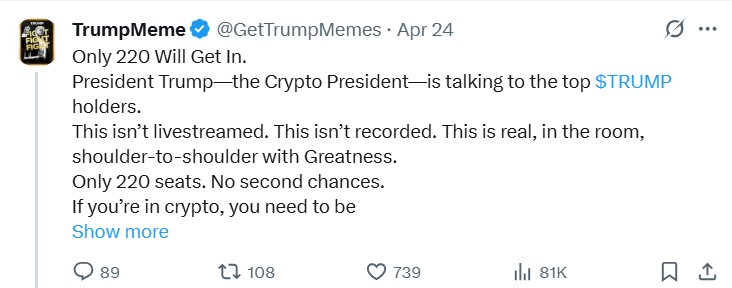 Dự án $TRUMP đã công bố một sự kiện đặc biệt: 20 đến 40 holder lớn nhất sẽ được mời tham gia một bữa tiệc riêng tư với Donald Trump. Đây không chỉ là cơ hội để gặp gỡ một trong những nhân vật quyền lực nhất thế giới, mà còn là dịp để các nhà đầu tư lớn như Justin Sun củng cố vị thế trong cộng đồng crypto.