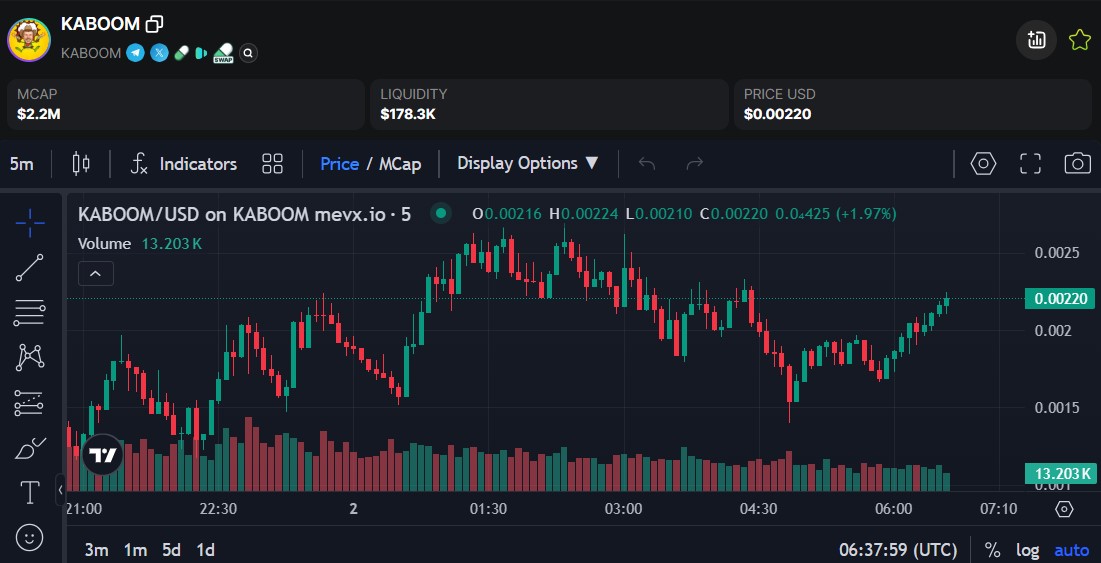 Dựa trên dữ liệu mới nhất từ sàn giao dịch MevX , KABOOM đang thể hiện hiệu suất ấn tượng trong thị trường memecoin: