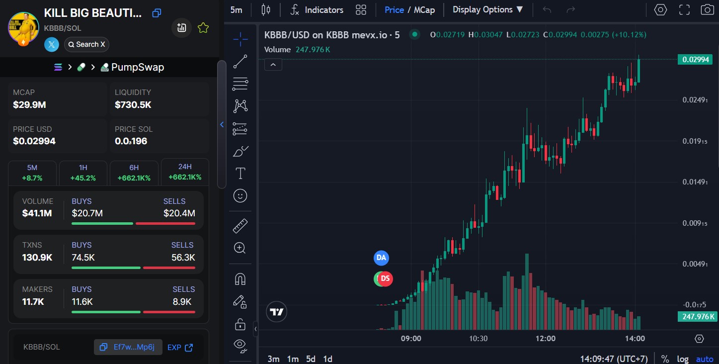 Biểu đồ giá trên MevX (khung thời gian 5 phút) ghi nhận mức tăng trưởng ấn tượng 662.1K% trong 24 giờ, đưa giá từ mức thấp lên 0.02994 USD (tương đương 0.0196 SOL). Tuy nhiên, khối lượng giao dịch đạt 247,976K và có dấu hiệu giảm sau khi chạm đỉnh, báo hiệu một đợt điều chỉnh giá có thể xảy ra trong thời gian tới.