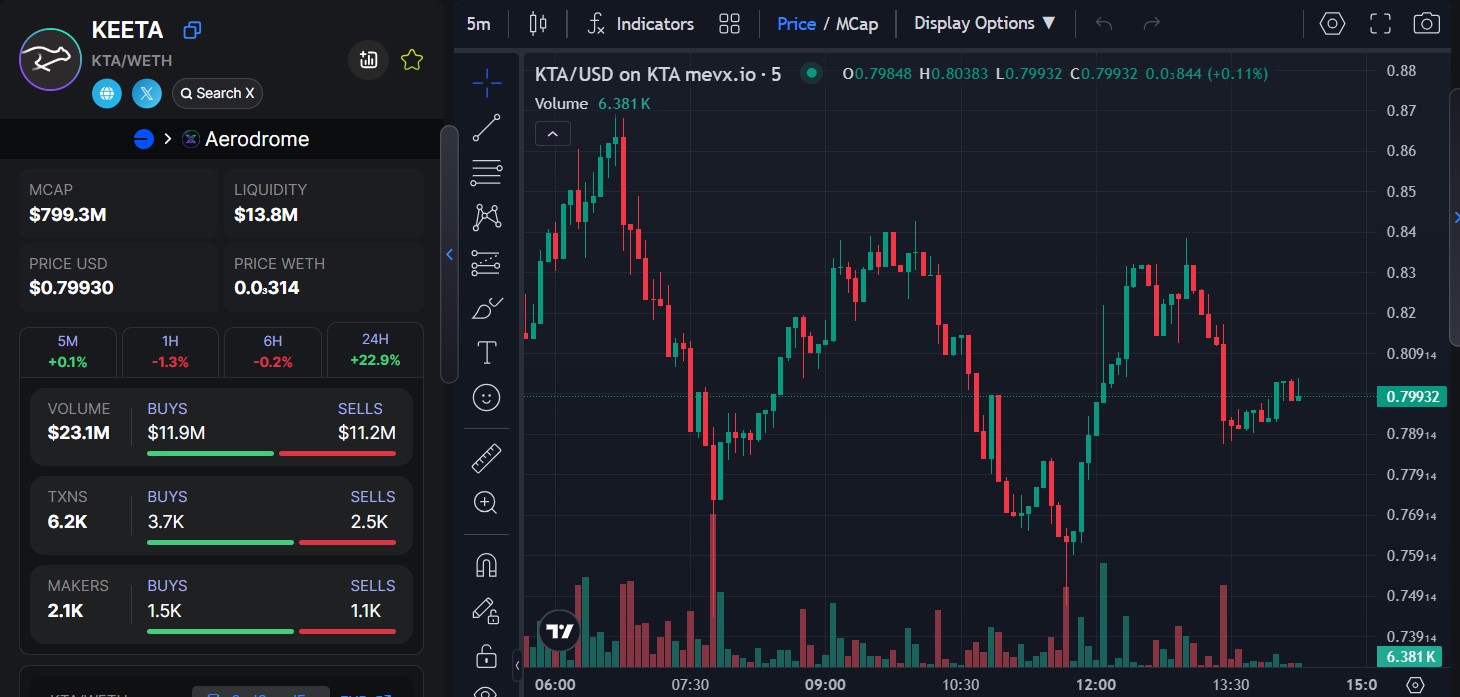 Dữ liệu thị trường của KEETA trên MevX cho thấy quy mô và mức độ quan tâm của nhà đầu tư đối với token này. Vốn hóa thị trường của KEETA hiện đạt 798,6 triệu USD, một con số ấn tượng, phản ánh vị thế đáng kể của dự án trong thị trường memecoin. Điều này cho thấy KEETA đã thu hút được lượng lớn nhà đầu tư và có tiềm năng phát triển trong dài hạn.