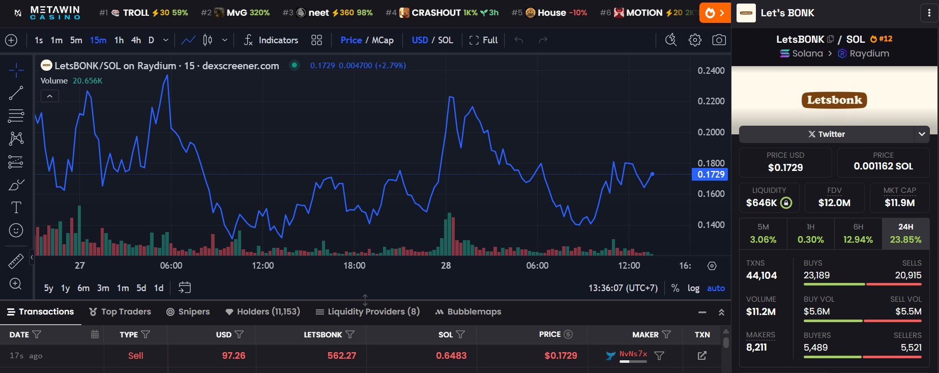 Biểu đồ giá cho thấy Let’s BONK đã trải qua một đợt tăng mạnh, đạt đỉnh 0.2400 USD, sau đó giảm về mức 0.1729 USD. Khối lượng giao dịch cũng cho thấy sự sụt giảm, với áp lực bán (sell volume: 5.5M) nhỉnh hơn áp lực mua (buy volume: 5.6M) trong 24 giờ qua.