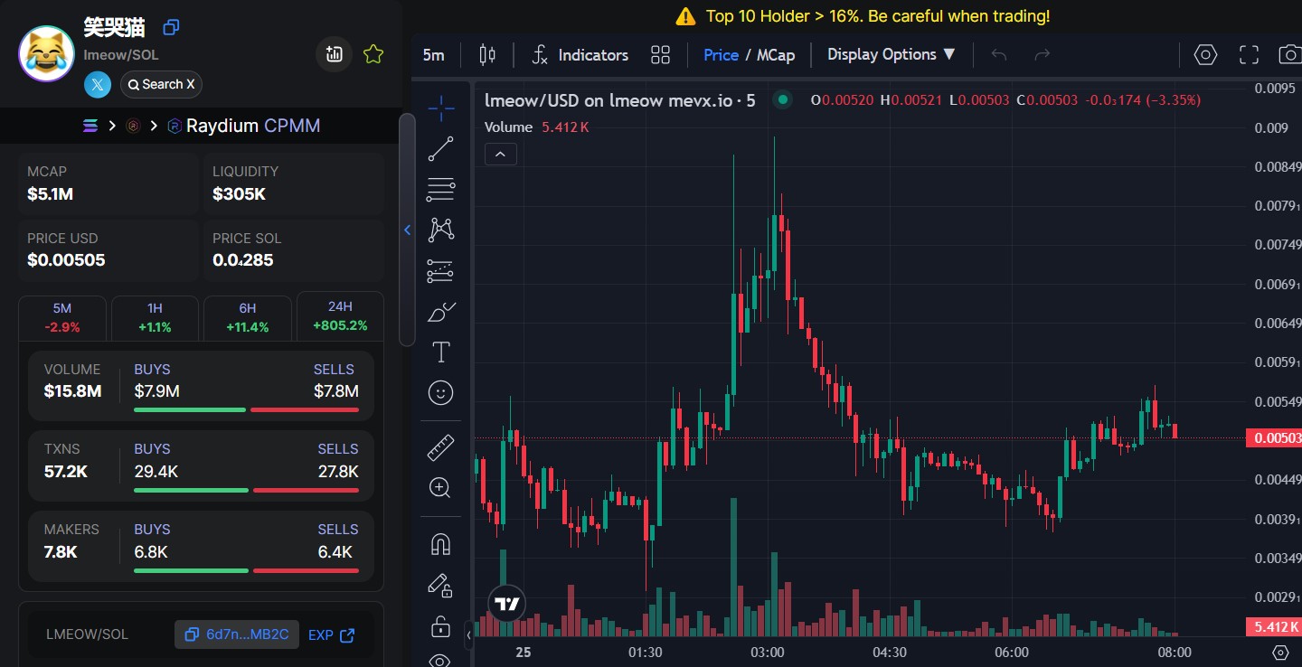 Với hơn 57.200 giao dịch chỉ trong 24h, LMEOW chứng minh sức hút cực mạnh, thu hút cả các nhà đầu tư nhỏ lẻ lẫn trader chuyên nghiệp. Đặc biệt, cảnh báo từ hệ thống về việc Top 10 Holder nắm hơn 16% cho thấy nhà đầu tư cần quản lý rủi ro chặt chẽ khi tham gia.
