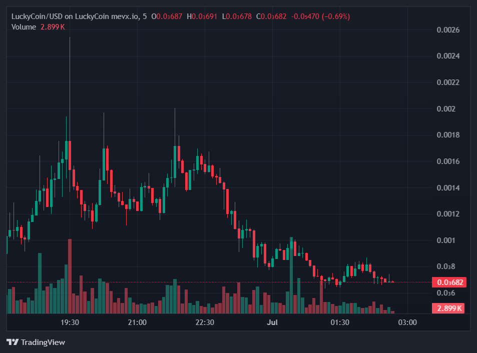 Tính đến ngày 01/07/2025, LuckyCoin đang thể hiện hiệu suất đáng chú ý trên sàn MevX. Dựa trên dữ liệu giao dịch mới nhất từ biểu đồ TradingView, đây là những con số nổi bật: