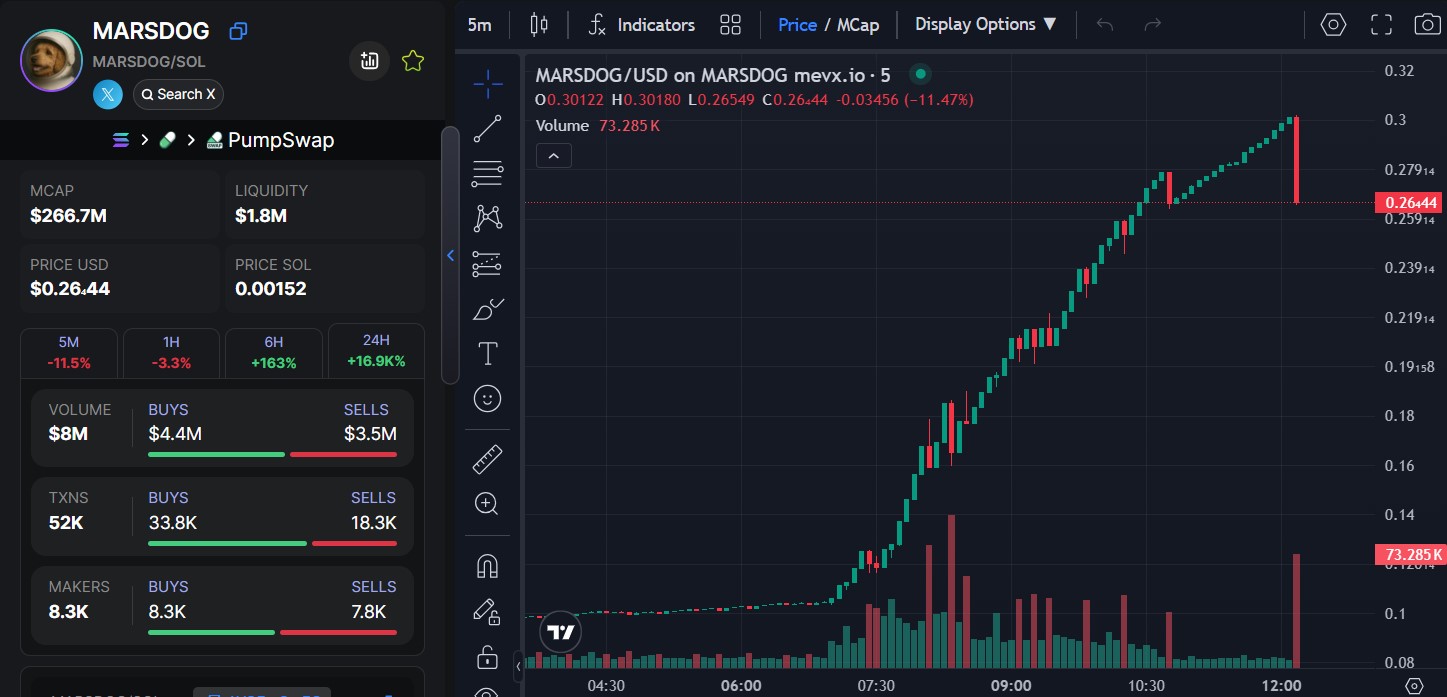 MARSDOG ra đời trên hệ sinh thái Solana, một blockchain nổi tiếng với tốc độ giao dịch nhanh và chi phí thấp, là điểm nóng cho các memecoin. Token này được tạo thông qua Pump.fun, một nền tảng giúp đơn giản hóa việc phát hành memecoin, tự động niêm yết token trên sàn giao dịch phi tập trung (DEX) như Raydium khi vốn hóa thị trường đạt khoảng 69.000 USD.