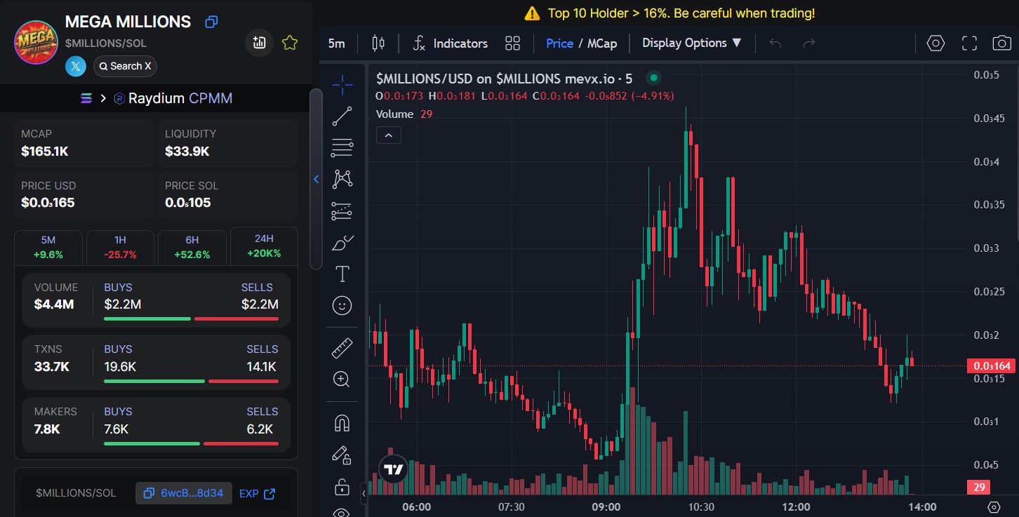 - Cơ hội từ làn sóng memecoin: $MILLIONS đang hưởng lợi từ xu hướng memecoin trên Solana, với khối lượng giao dịch $4.4M cho thấy sự quan tâm mạnh mẽ từ cộng đồng.