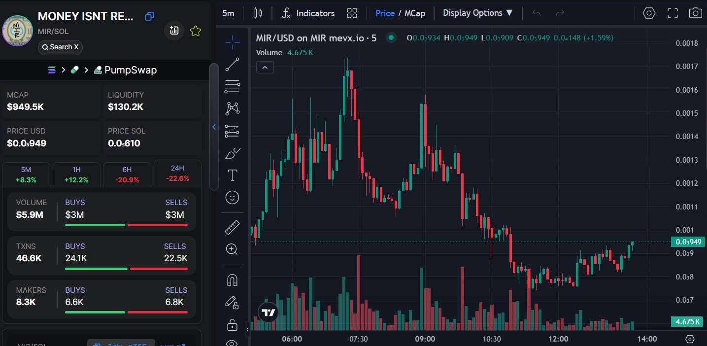 MIR – Money Isn’t Real là một memecoin đầy táo bạo, kết hợp giữa châm biếm và văn hóa crypto để tạo nên một hiện tượng thú vị trên Solana. Với vốn hóa $949.5K, khối lượng giao dịch $5.9M, và câu chuyện độc đáo, MIR đang có khởi đầu đầy triển vọng. Tuy nhiên, sự biến động giá và rủi ro từ mô hình Pump.Fun đòi hỏi nhà đầu tư phải thận trọng. Nếu bạn yêu thích meme và sẵn sàng chấp nhận rủi ro, MIR có thể là một lựa chọn đáng cân nhắc.