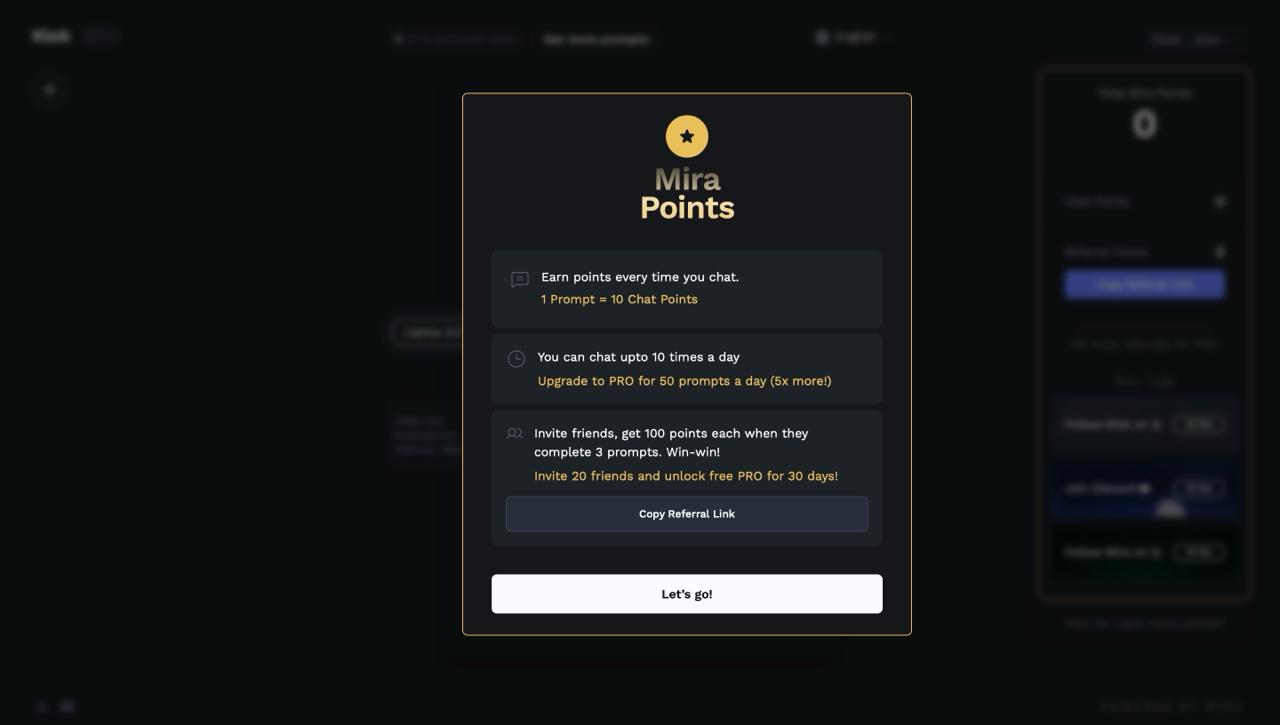 Hiện nay, Mira Network đang triển khai ứng dụng Klok, nơi người dùng có thể kiếm được 10 điểm Mira mỗi ngày chỉ bằng cách sử dụng các tính năng AI. Ngoài ra, bạn còn có thể mời bạn bè tham gia để tích lũy thêm điểm thông qua hệ thống giới thiệu. Mặc dù token chính thức chưa được phát hành, nhưng số điểm này rất có thể sẽ trở thành “vé vàng” để nhận thưởng khi airdrop diễn ra trong tương lai.