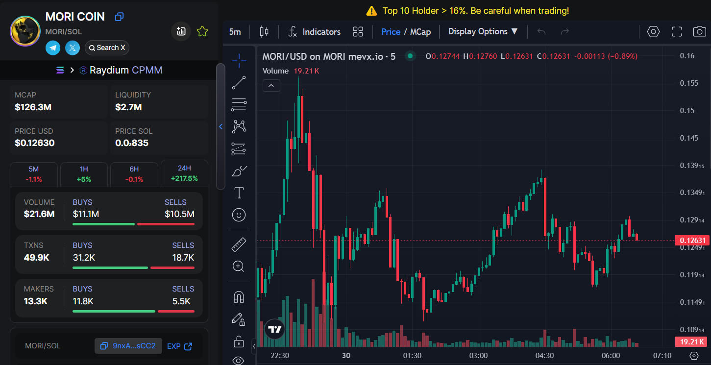 - Con số này phản ánh quy mô ngày càng lớn của MORI, đặt nó vào vị trí cạnh tranh với các token khác trên Solana. Tuy nhiên, cảnh báo “Top 10 Holder > 16%, Be careful when trading!” cho thấy sự tập trung sở hữu cao, tiềm ẩn rủi ro.