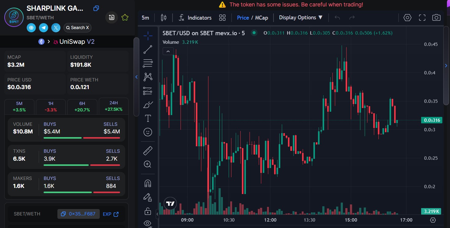 Mặc dù giá tăng 27.5% trong 24 giờ, biểu đồ giá cho thấy sự biến động mạnh, với đỉnh 0.45 USD và đáy 0.20 USD trong ngày. Điều này phản ánh tính đầu cơ cao của SBET. Ngoài ra, cảnh báo “token has some issues” từ MevX là một dấu hiệu đỏ, có thể liên quan đến thanh khoản, phân bổ ví, hoặc rủi ro hợp đồng thông minh.