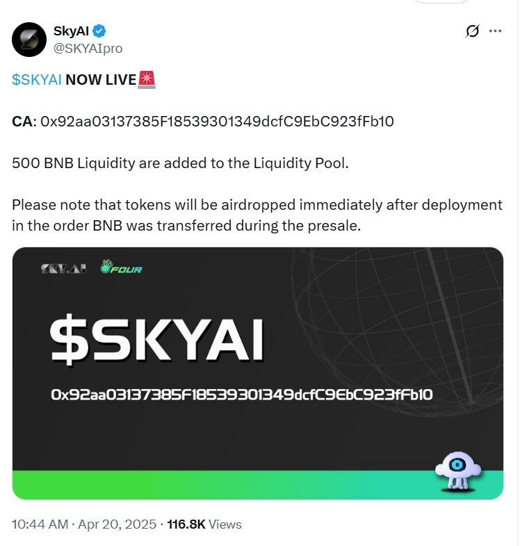 SKYAI chính thức được công bố ra mắt vào ngày 20 tháng 4 năm 2025 thông qua một bài đăng trên X từ tài khoản SKYAIpro. Token này có địa chỉ hợp đồng là 0x92aa03137385F18539301349dcfC9EbC923fFb10 và hoạt động trên BNB Chain. Để hỗ trợ giao dịch, dự án đã bổ sung 500 BNB (tương đương khoảng 300.000 USD) vào pool thanh khoản trên PancakeSwap, một sàn giao dịch phi tập trung quen thuộc với người dùng BNB Chain. Ngoài ra, SKYAI cũng triển khai một chương trình airdrop dành cho những người tham gia presale, nhằm tăng cường sự tham gia từ cộng đồng ngay từ những ngày đầu.