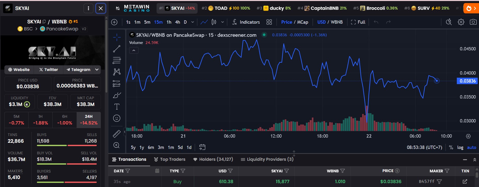 Dựa trên thông tin từ DexScreener, SKYAI đã ghi nhận một số con số đáng chú ý kể từ khi ra mắt. Vốn hóa thị trường cao nhất (market cap ATH) của token đạt 45 triệu USD, trong khi vốn hóa hiện tại đang ở mức 38.3 triệu USD. Volume giao dịch trong 24 giờ qua đạt 36.7 triệu USD, cho thấy mức độ quan tâm lớn từ các nhà giao dịch. Những con số này phản ánh sự sôi động của SKYAI trên thị trường, dù chỉ mới xuất hiện trong thời gian ngắn.