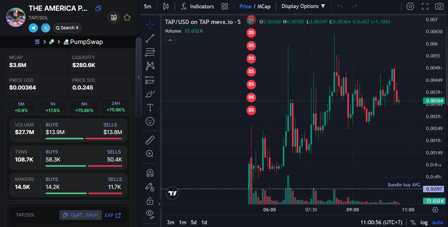 Dữ liệu từ các công cụ phân tích cho thấy khối lượng giao dịch của $TAP đạt hơn 18.52 triệu USD trong 4 giờ đầu, với giá hiện tại dao động quanh 0.00364 USD. Tuy nhiên, sự tham gia của bot và các tài khoản quảng bá cũng làm dấy lên lo ngại về khả năng thao túng giá.