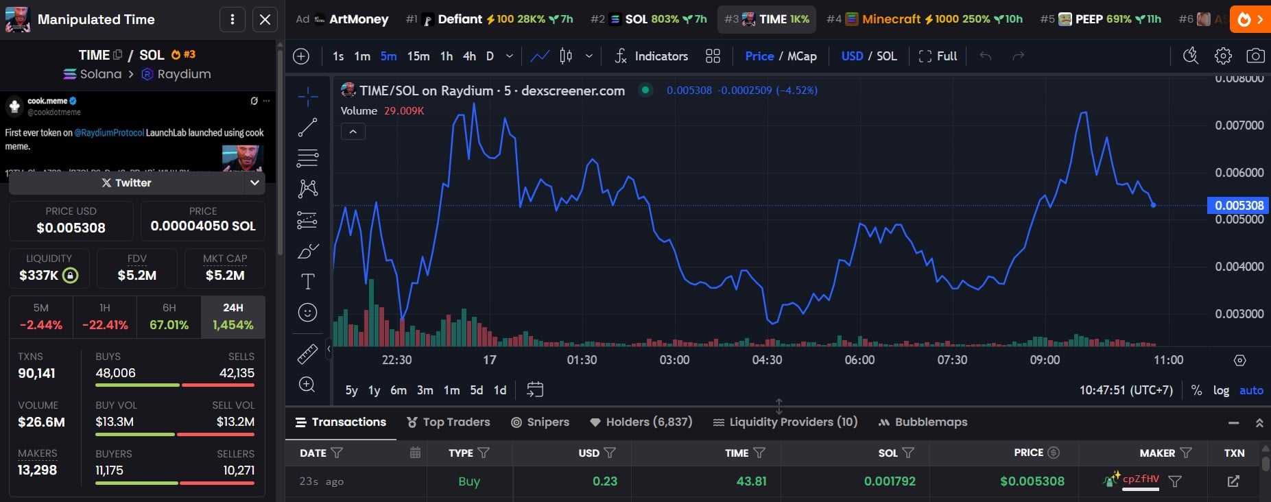 - Giá hiện tại: Theo biểu đồ 5 phút trên Dexscreener, giá $TIME là 0.005308 USD (tương đương 0.00004050 SOL).