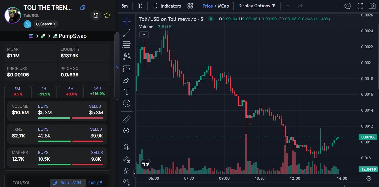 Biểu đồ giá cho thấy Toli đã trải qua một đợt tăng mạnh trong vài giờ qua, nhưng cũng có những giai đoạn giảm sâu, phản ánh tính biến động cao đặc trưng của memecoin. Dữ liệu này có thể thay đổi nhanh chóng, vì vậy hãy theo dõi sát sao trên Toli mev.io hoặc các sàn DEX như Raydium.